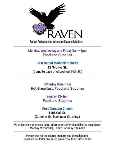 We currently operate out of two different locations: First United Methodist Church (1376 Olive Street), and First Christian Church (1166 Oak Street). We are open every day of the week except Tuesdays and Thursdays. See our flyer below for corresponding hours & loctions: